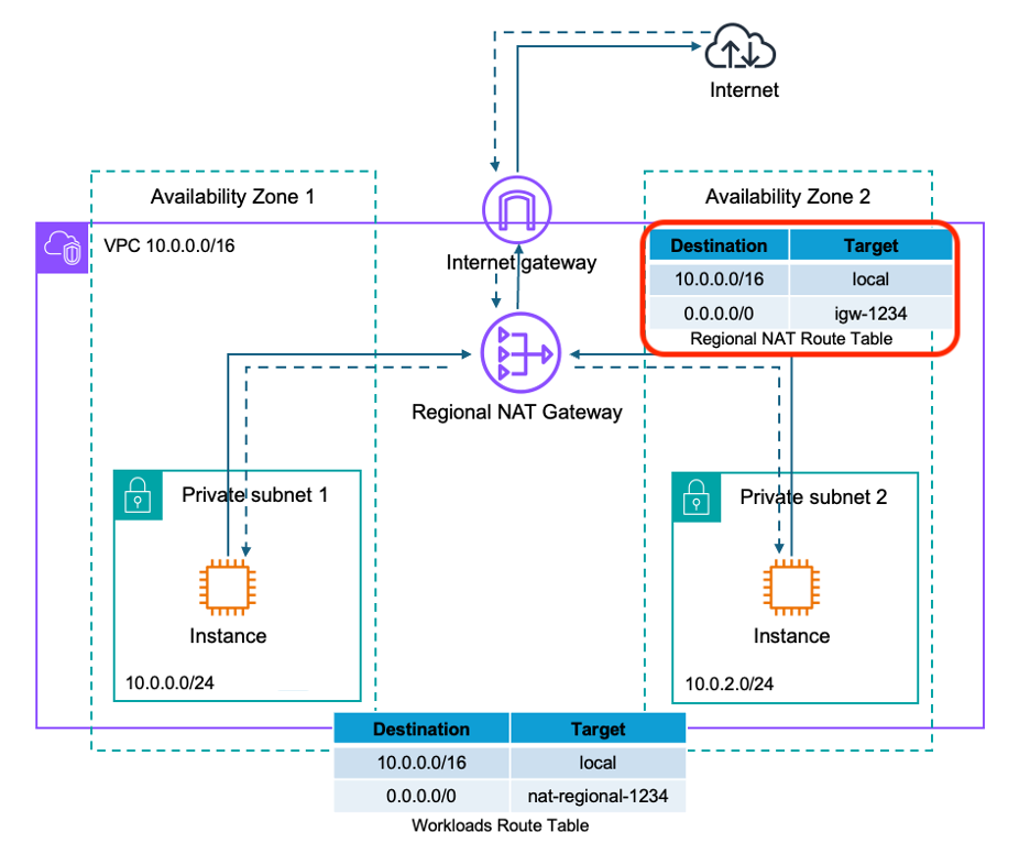 Note there is one new component in above setup - the Regional NAT Route Table. It is created automatically with a pre-configured route to the Internet Gateway. But you can customize it to route to middleboxes like firewalls, enabling traffic inspection for outbound flows. See AWS blog post for more details.